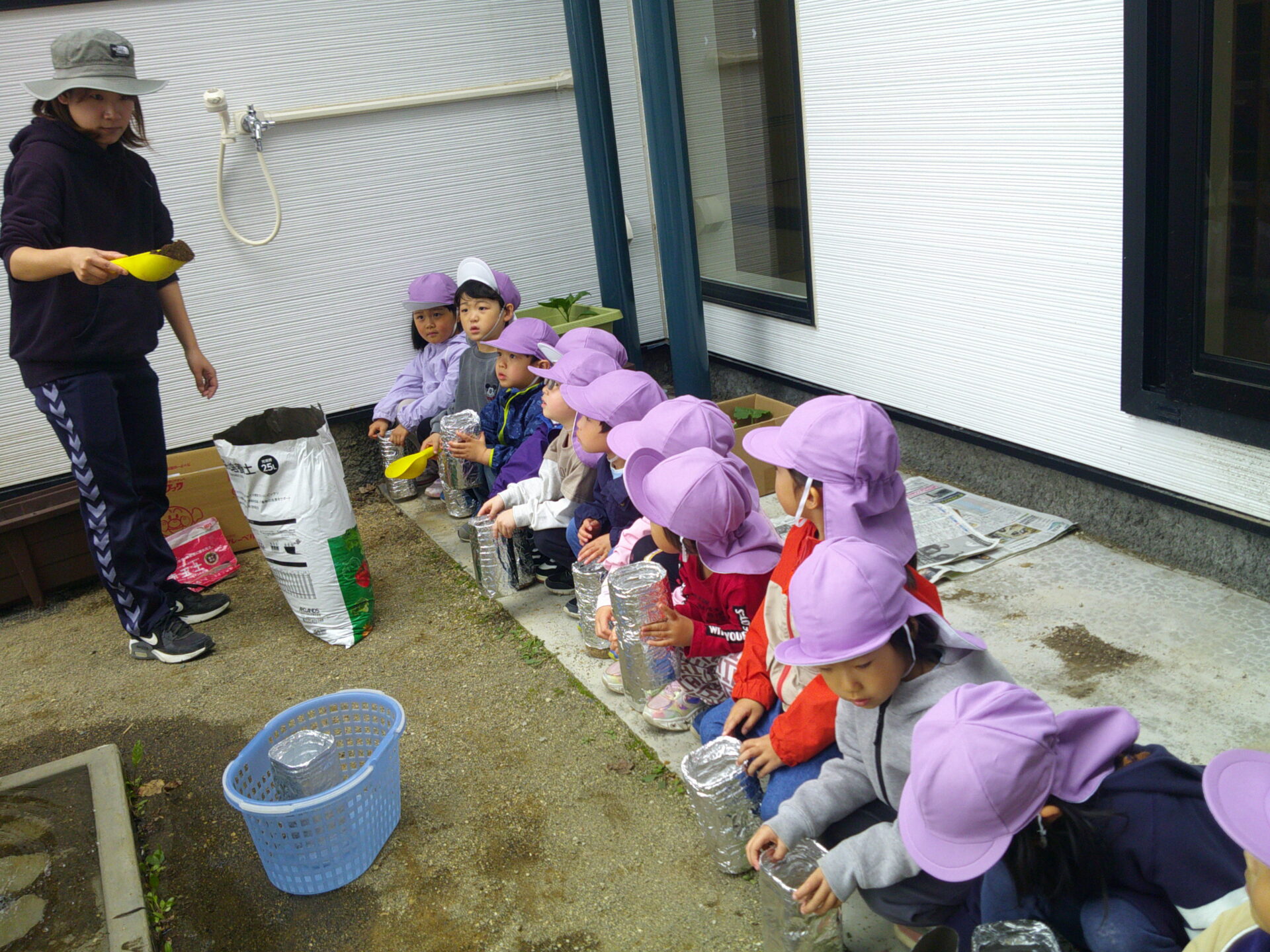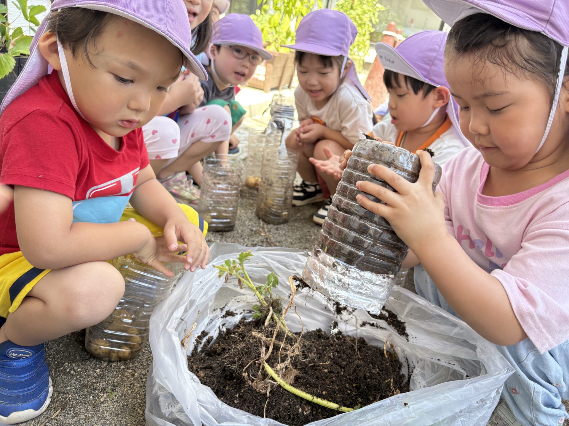中を開けてみよう!となったので、園庭に集まってペットボトルから土をだしていきましたよ。