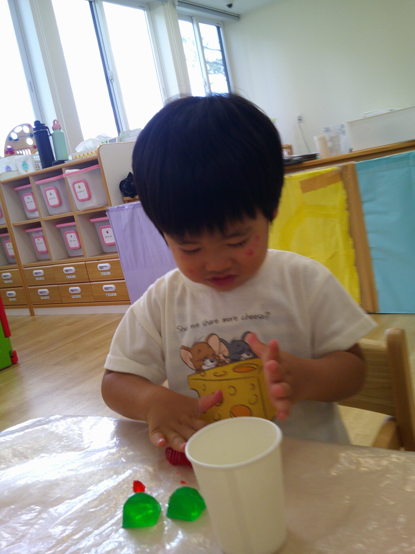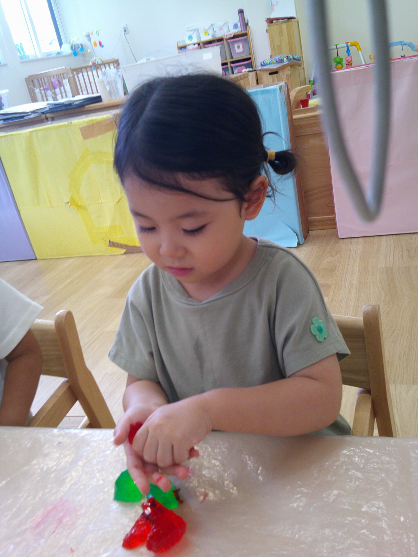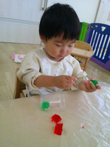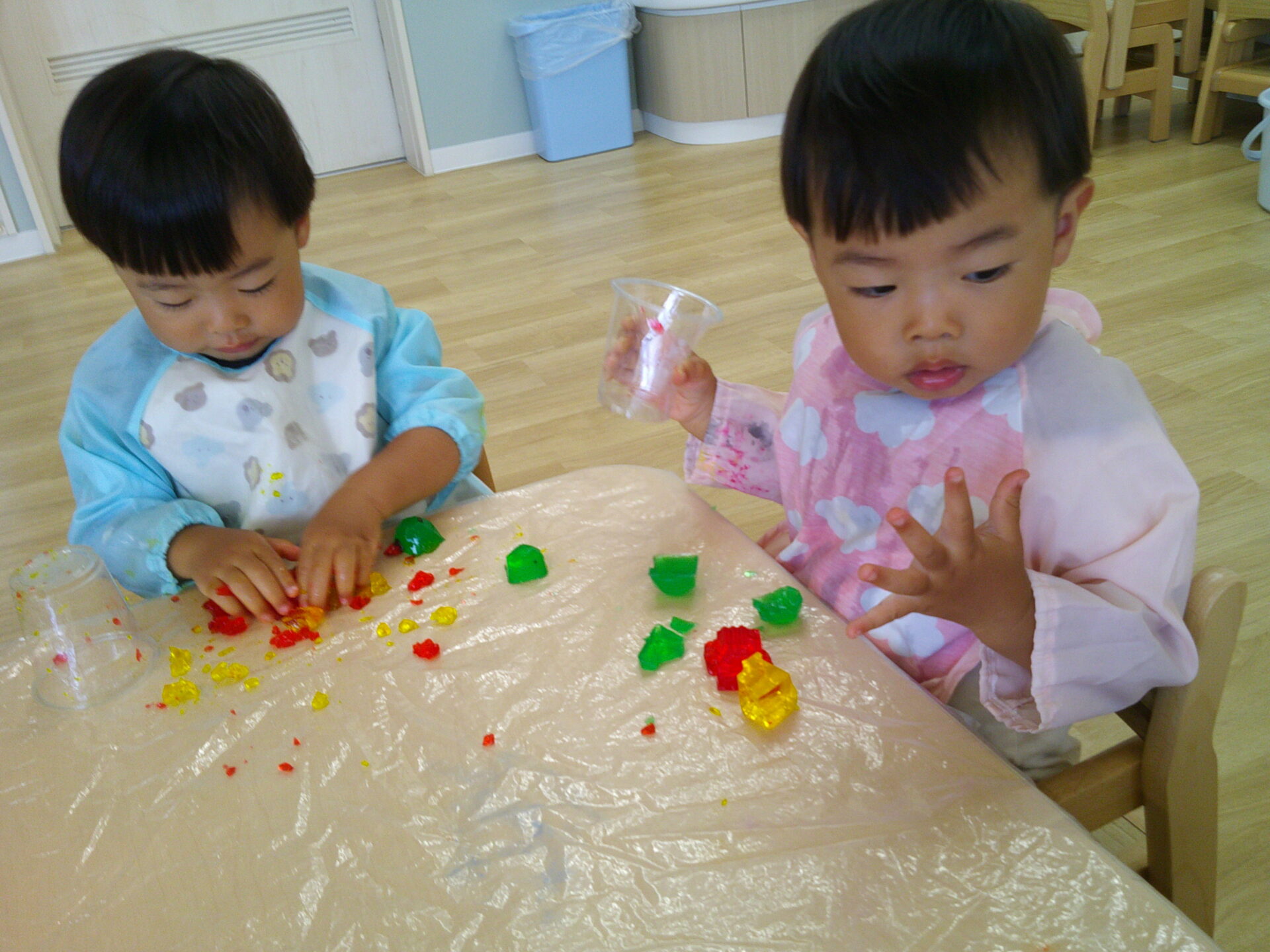 今日は、0・1歳が合同で感触遊びをおこないました。
