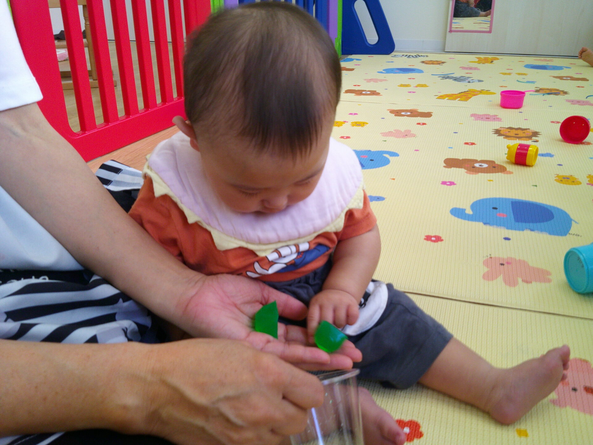 うみさん(0歳)は先生と一緒に!不思議そうな表情をしながらも手を伸ばしていますよ。