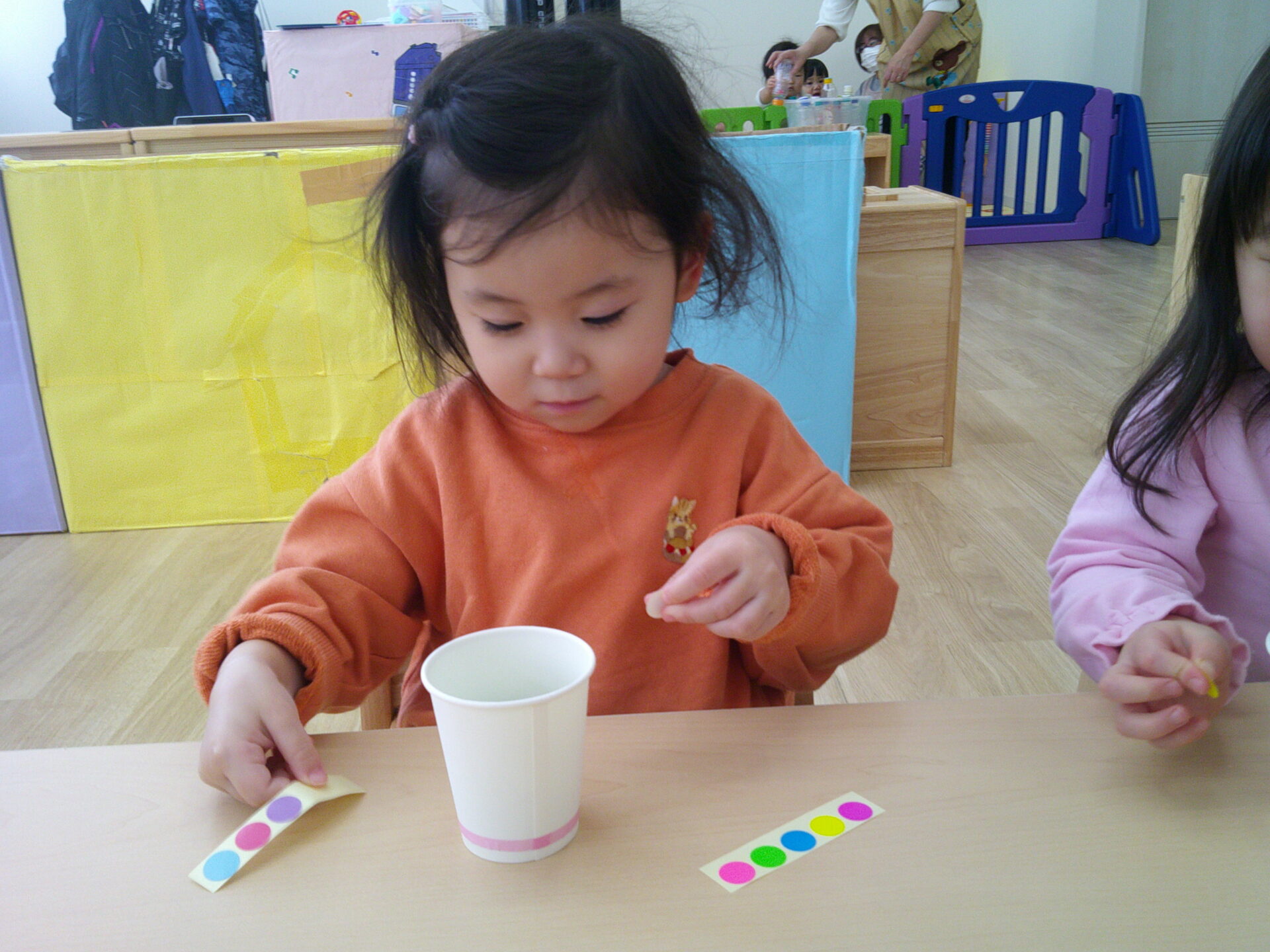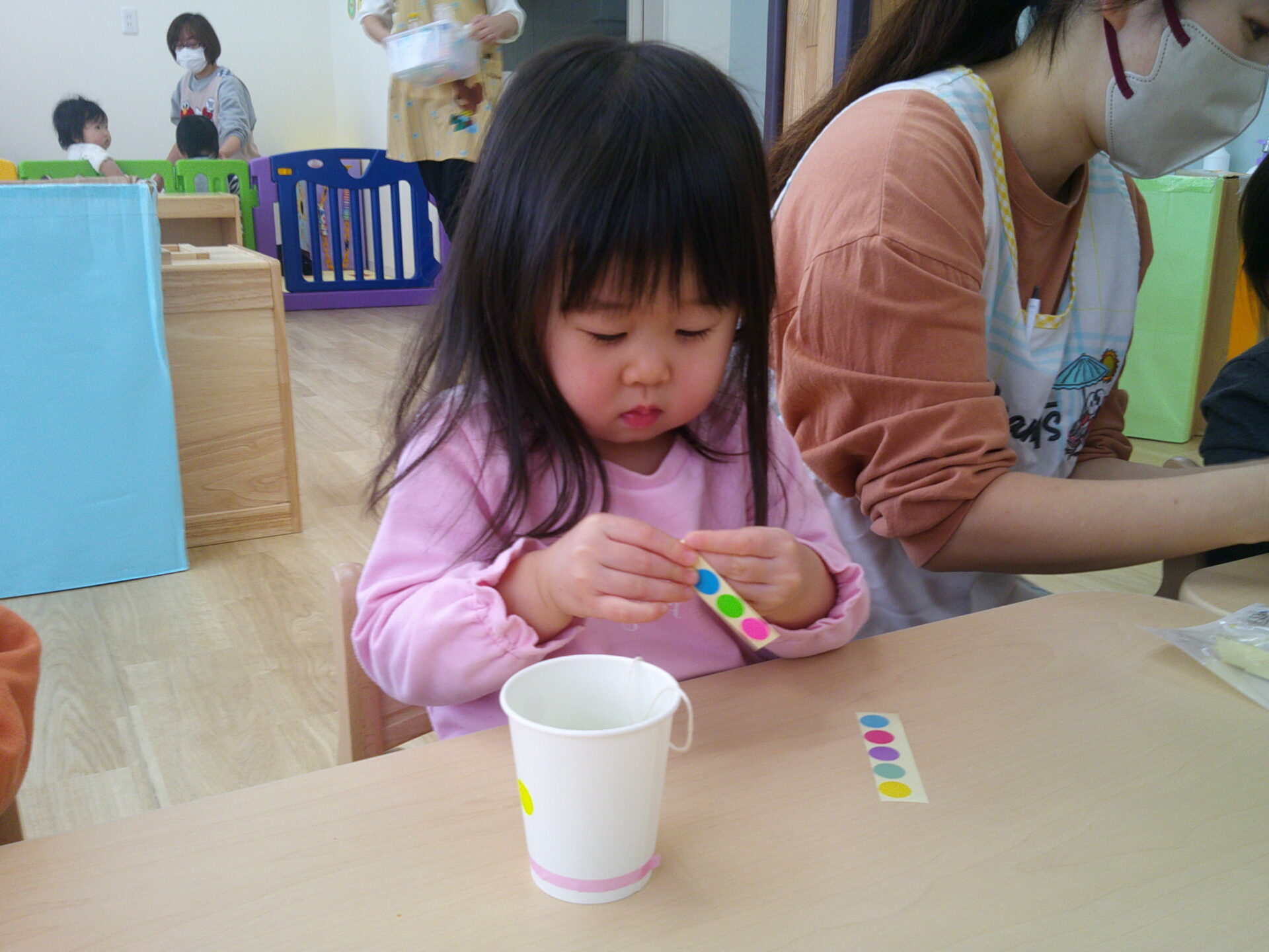 玉が紐で紙コップについているので、まずはその紙コップに丸シールで素敵にデコレーション♪