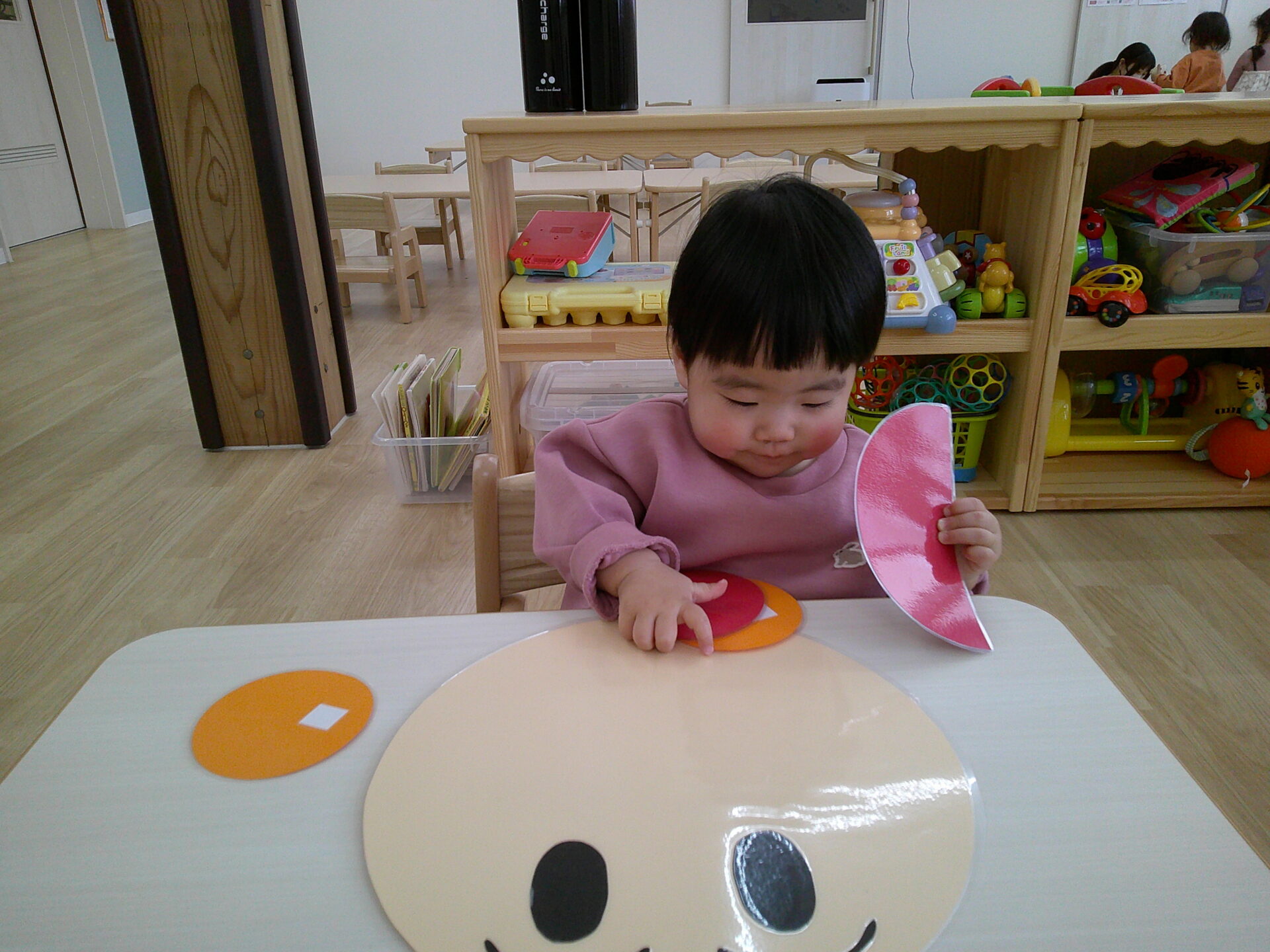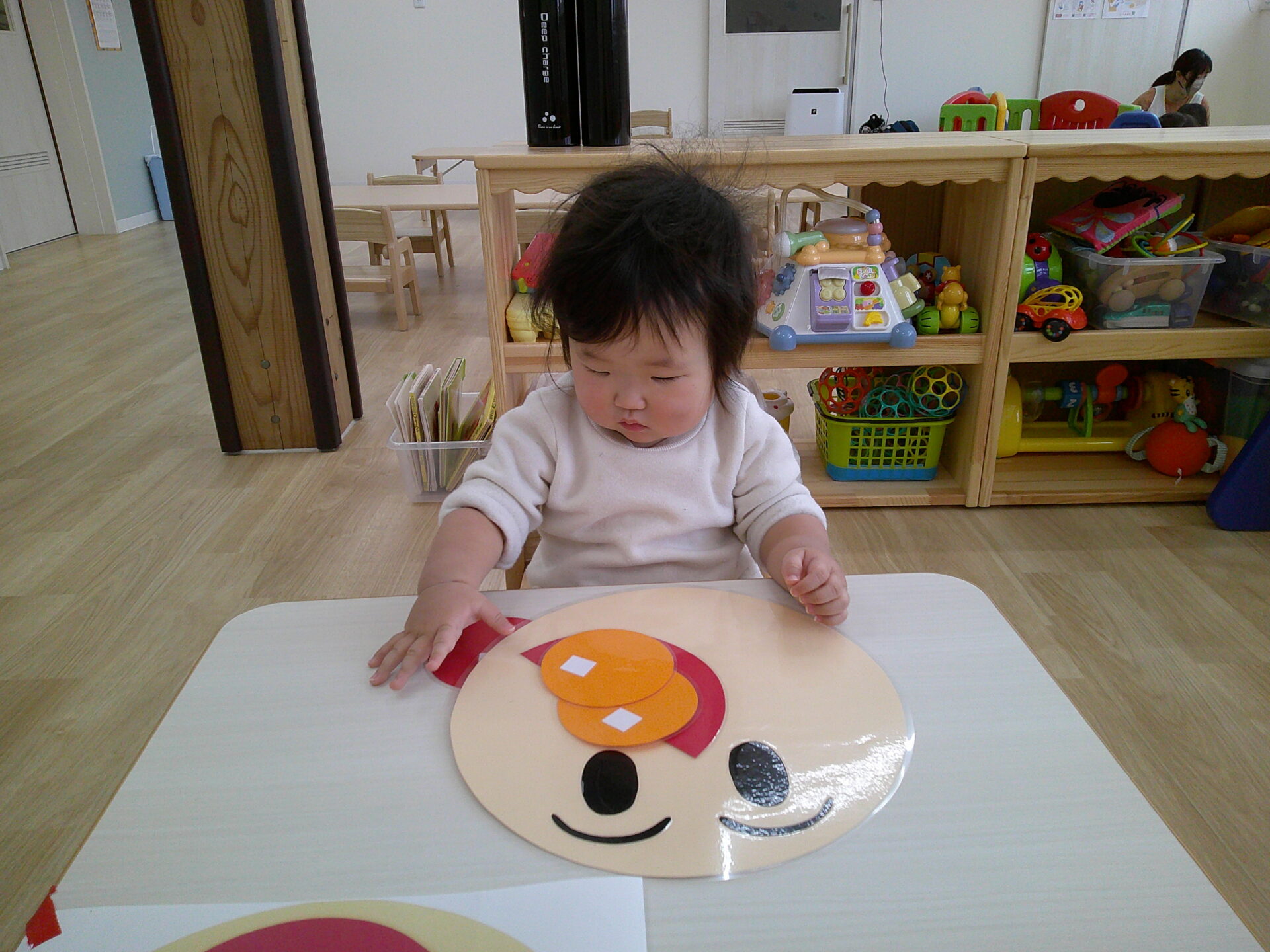 鼻や口のパーツを真剣な顔で置いて可愛いアンパンマンが出来ました!