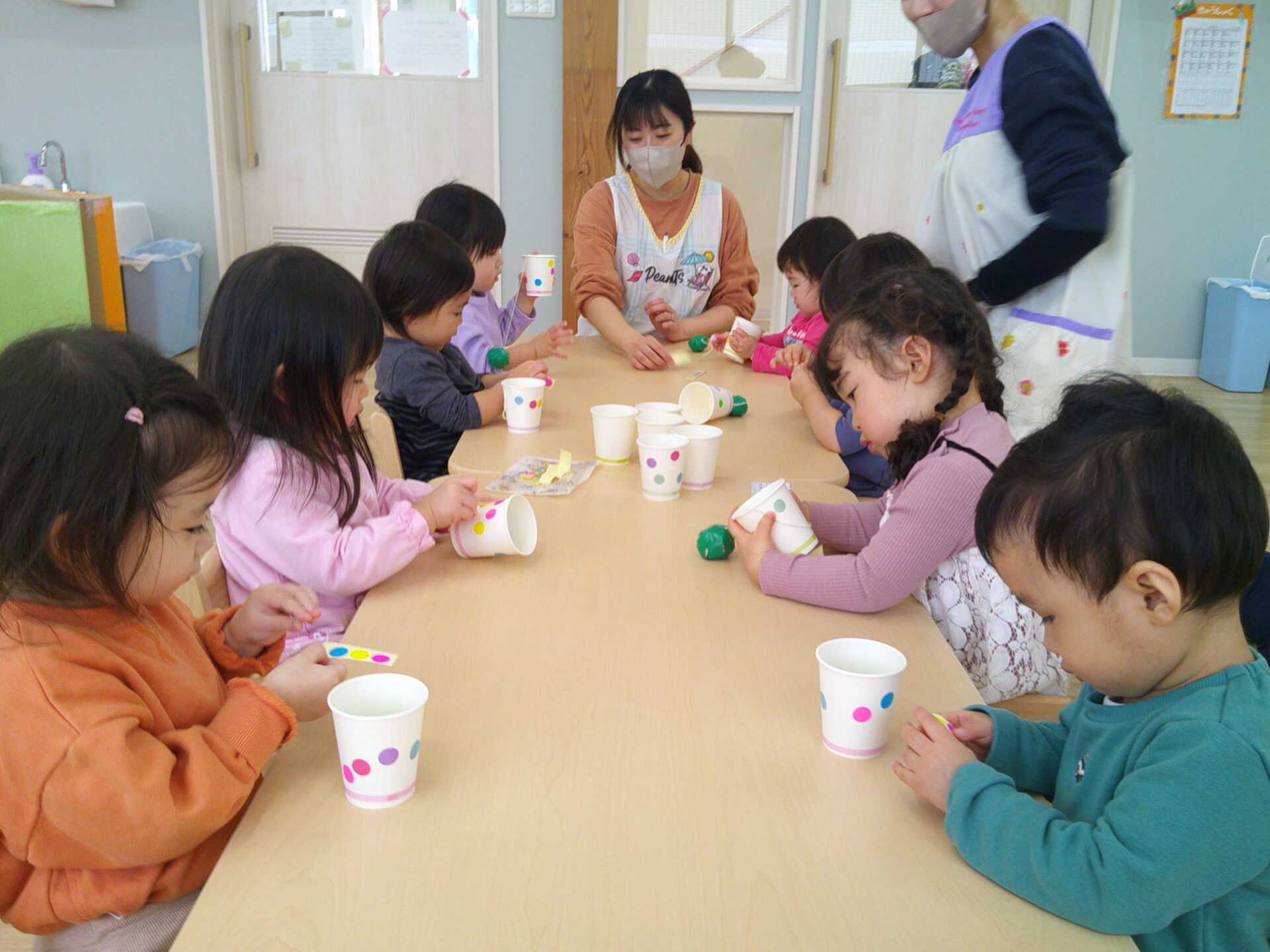 だいちチームさんは紙コップけん玉を1人1つずつ作って遊んでみました。