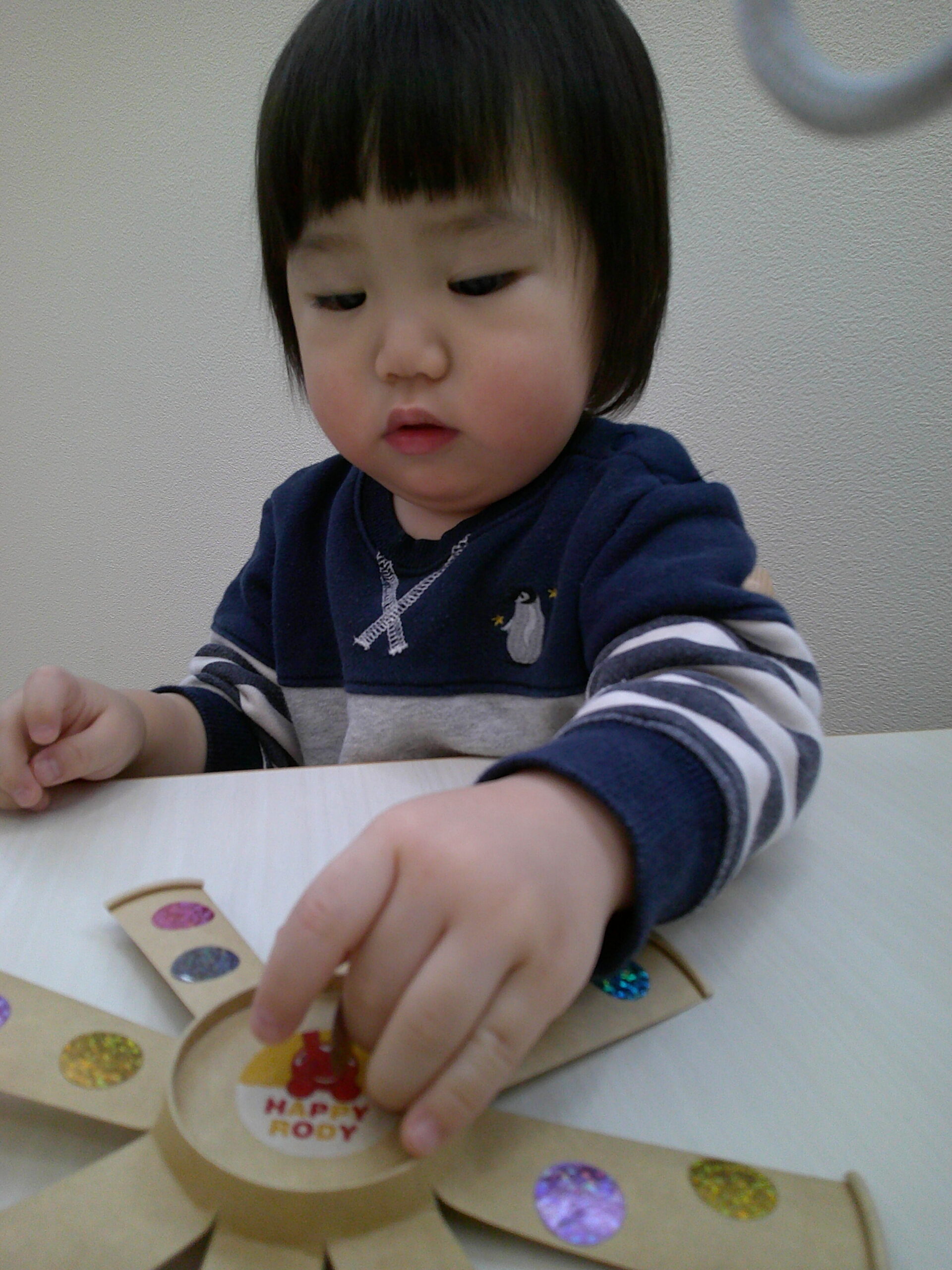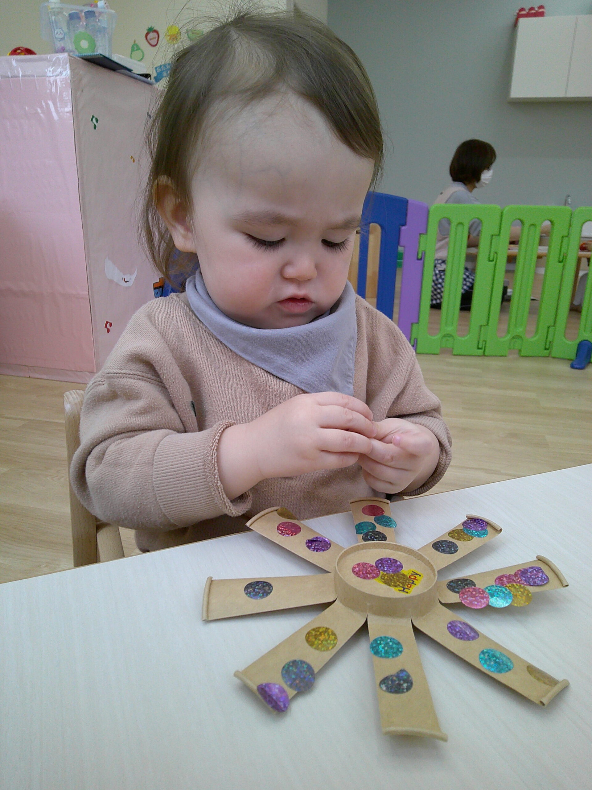 紙コップコマにキラキラシールを貼ってみたら、とっても集中してたくさん貼って可愛くしてくれました。
