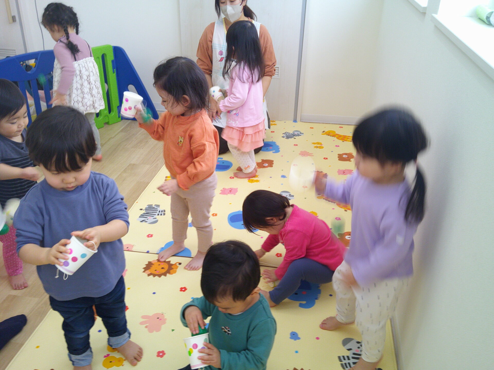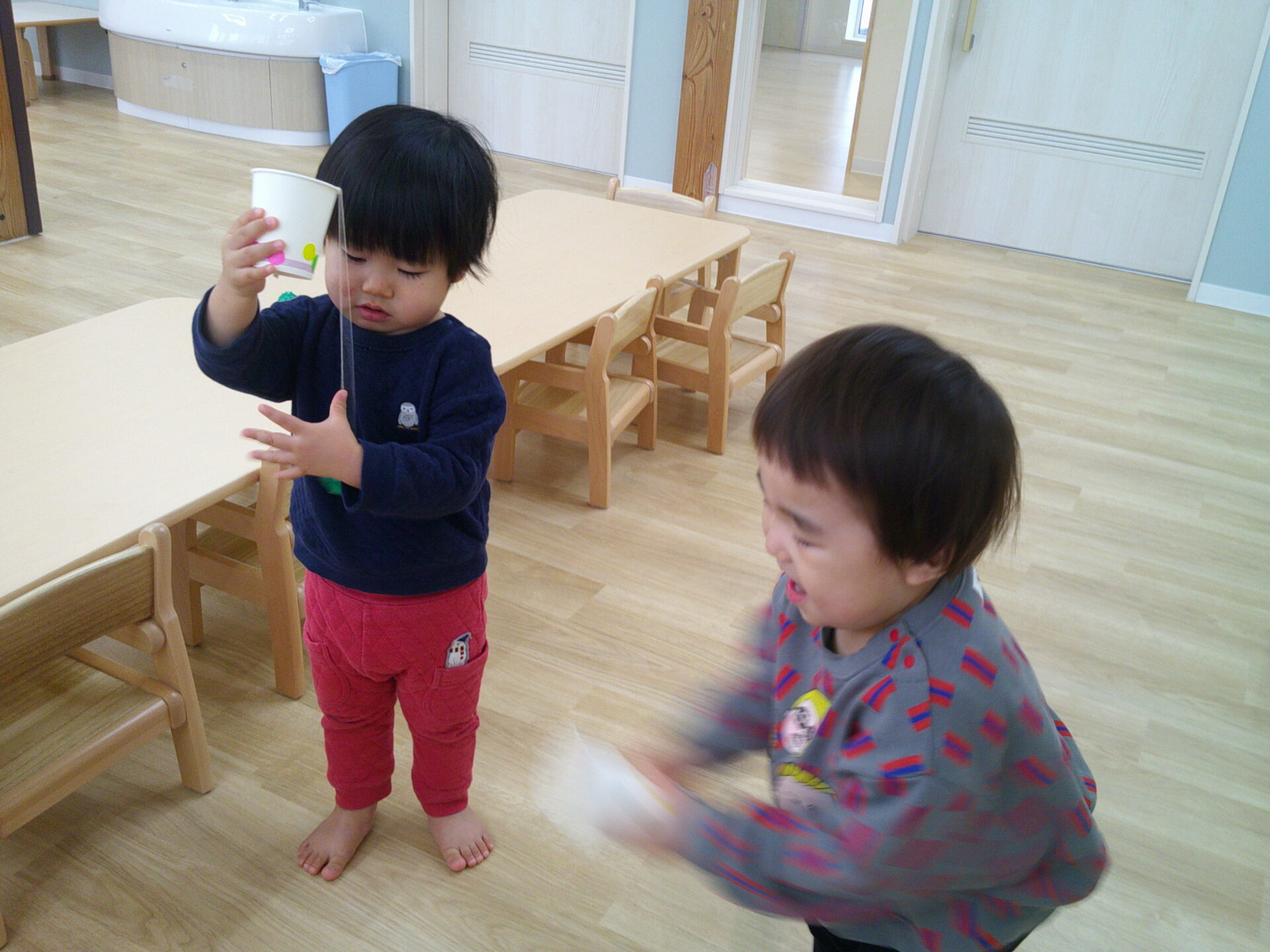 紙コップコマはクルクル回すのは難しかったですが、保育士が回すコマをじーっと見つめていました!