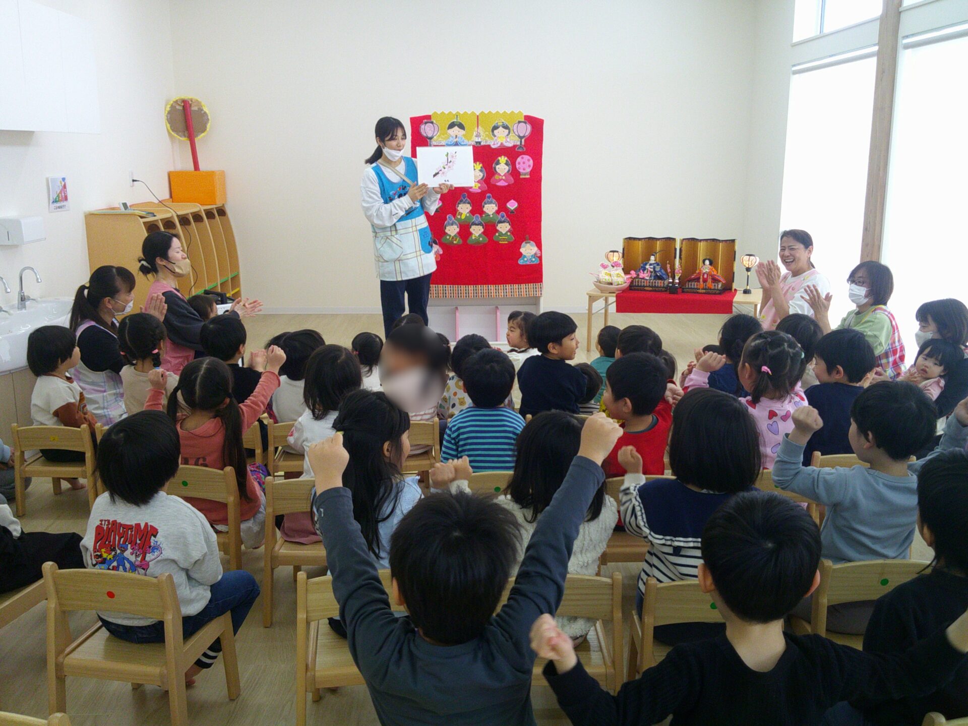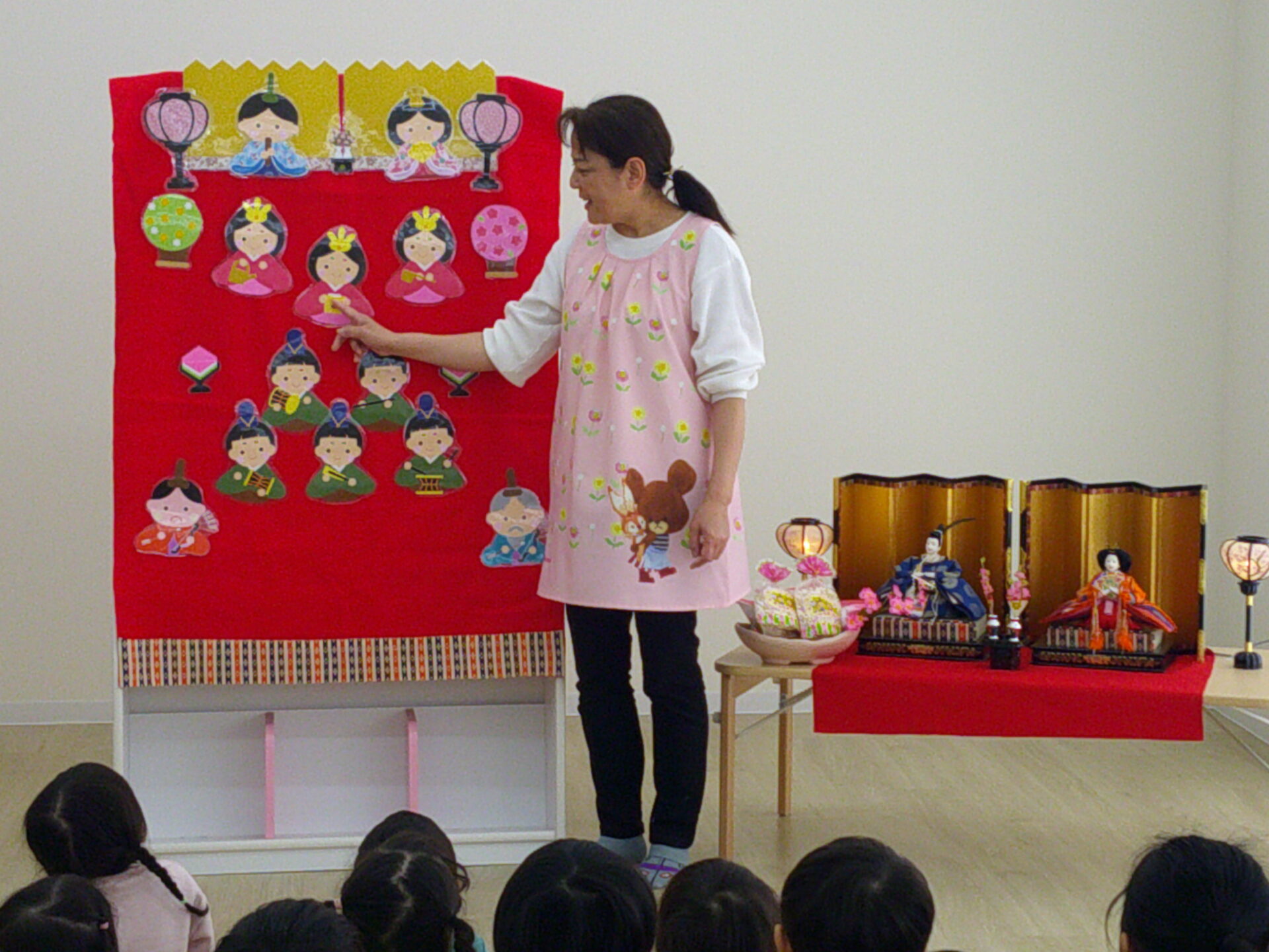 まずは、♪うれしいひなまつりの歌に合わせて、ひな人形を一つ一つ飾っていきました。