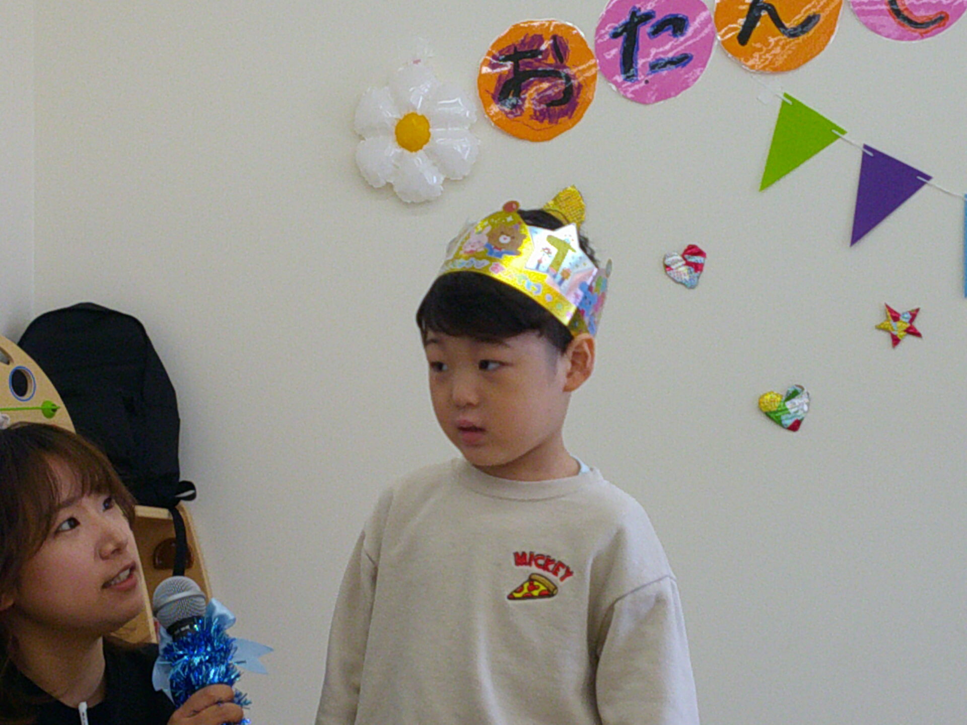 誕生児が緊張気味に登場したて インタビューを受ける姿も