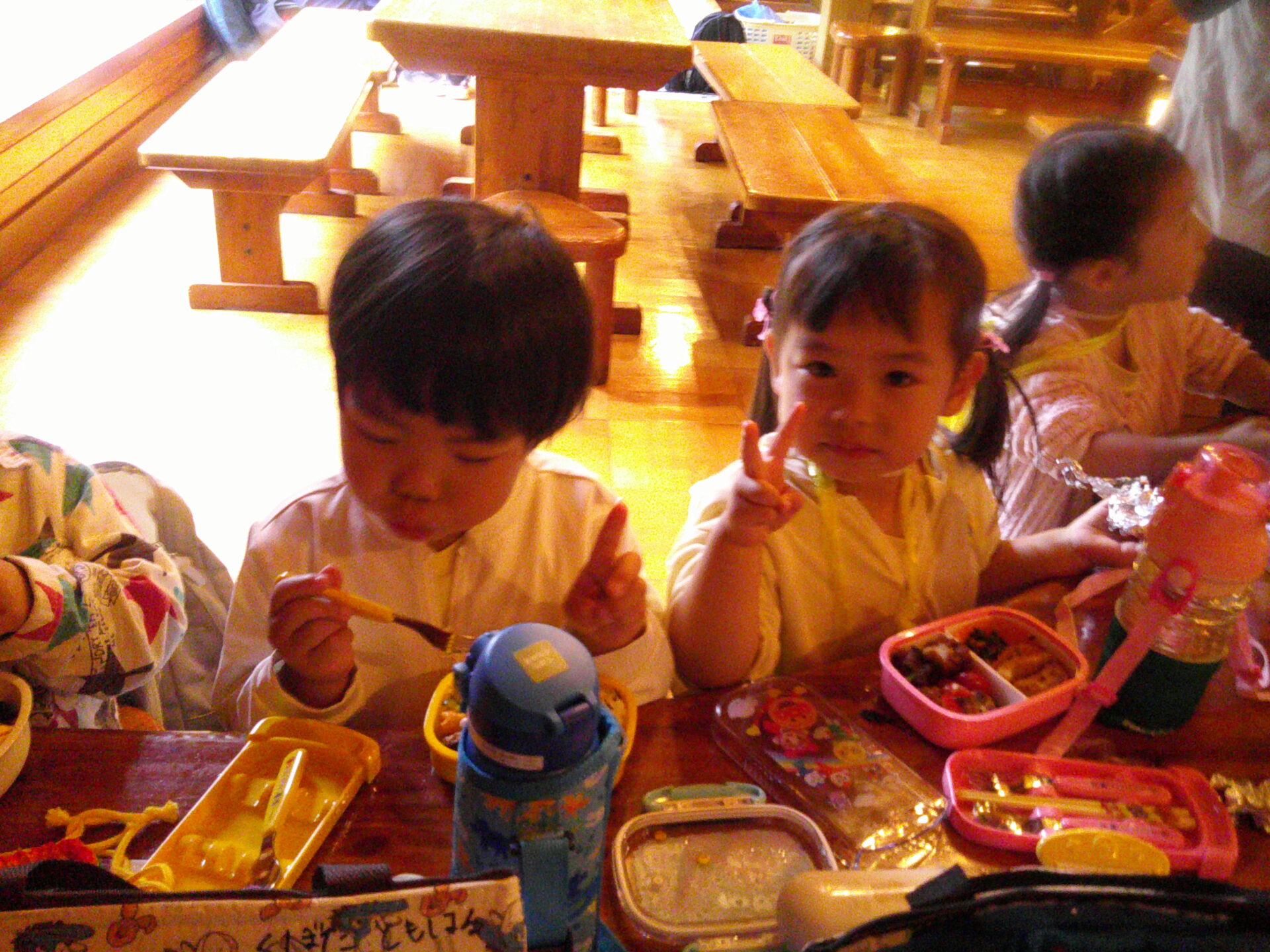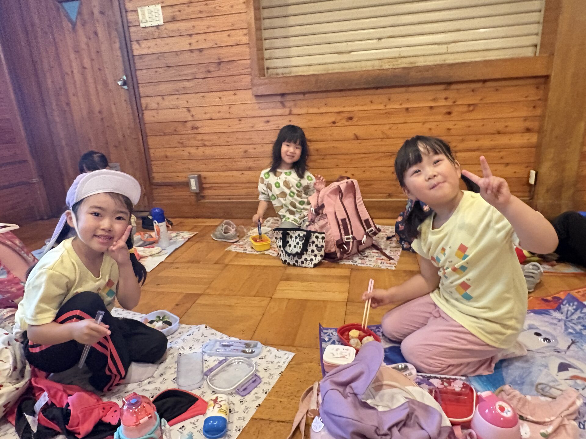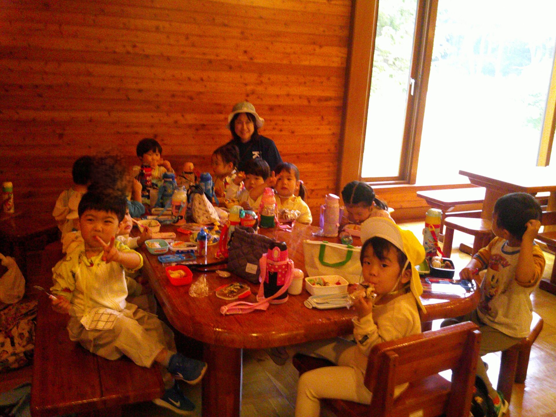遠足のもう一つのお楽しみはお弁当!いつもより早い時間から「もうお腹すいたから早くお弁当食べよう」という子どもたち、家でお母さんが作ってくれたお弁当を心待ちにしていたみたいです。