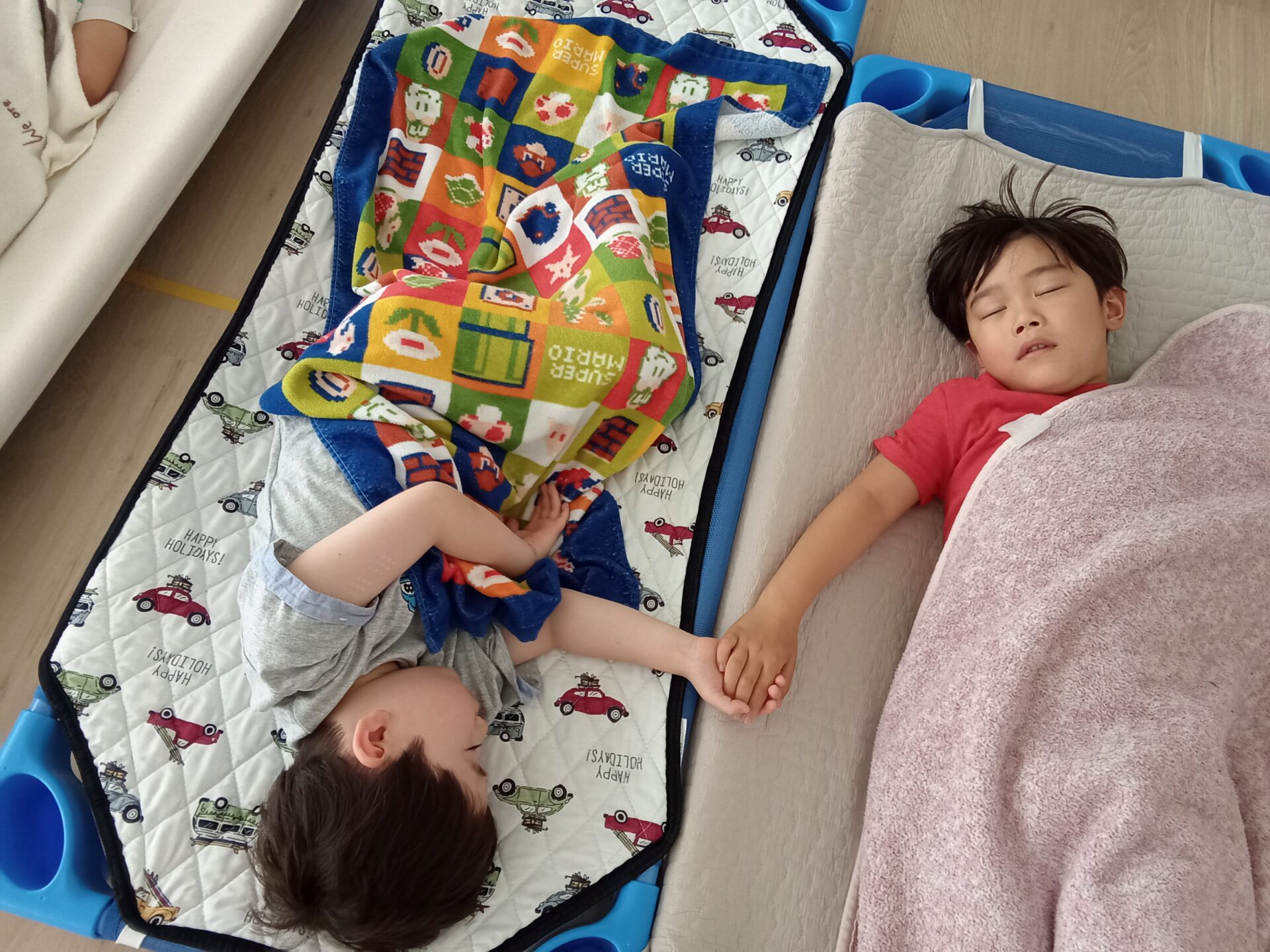 手をつないでお昼寝をしている