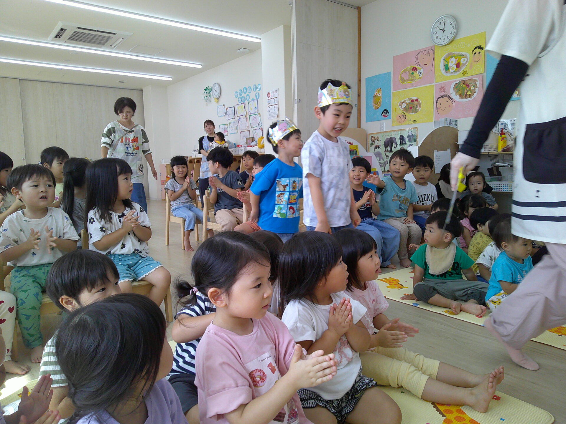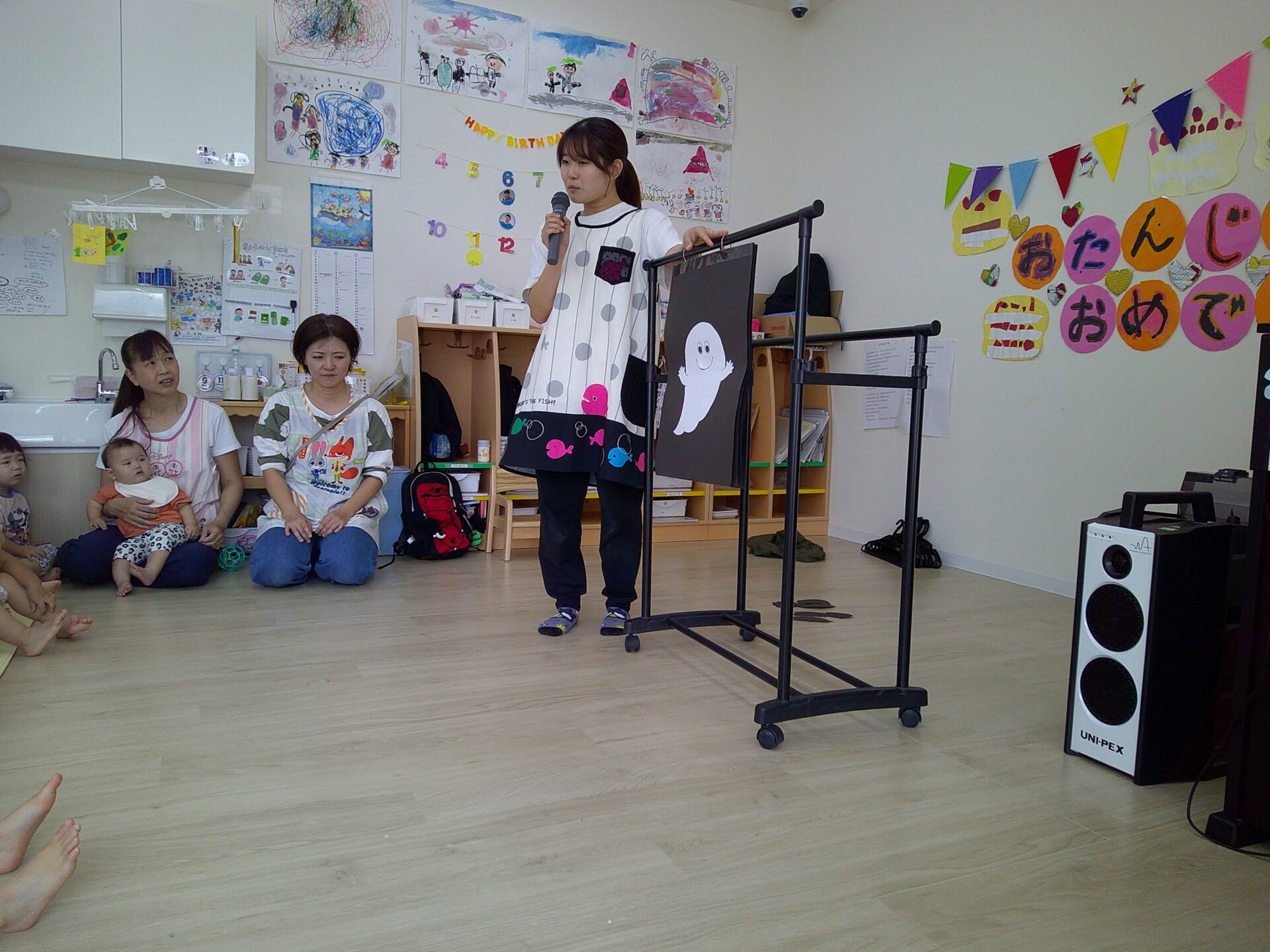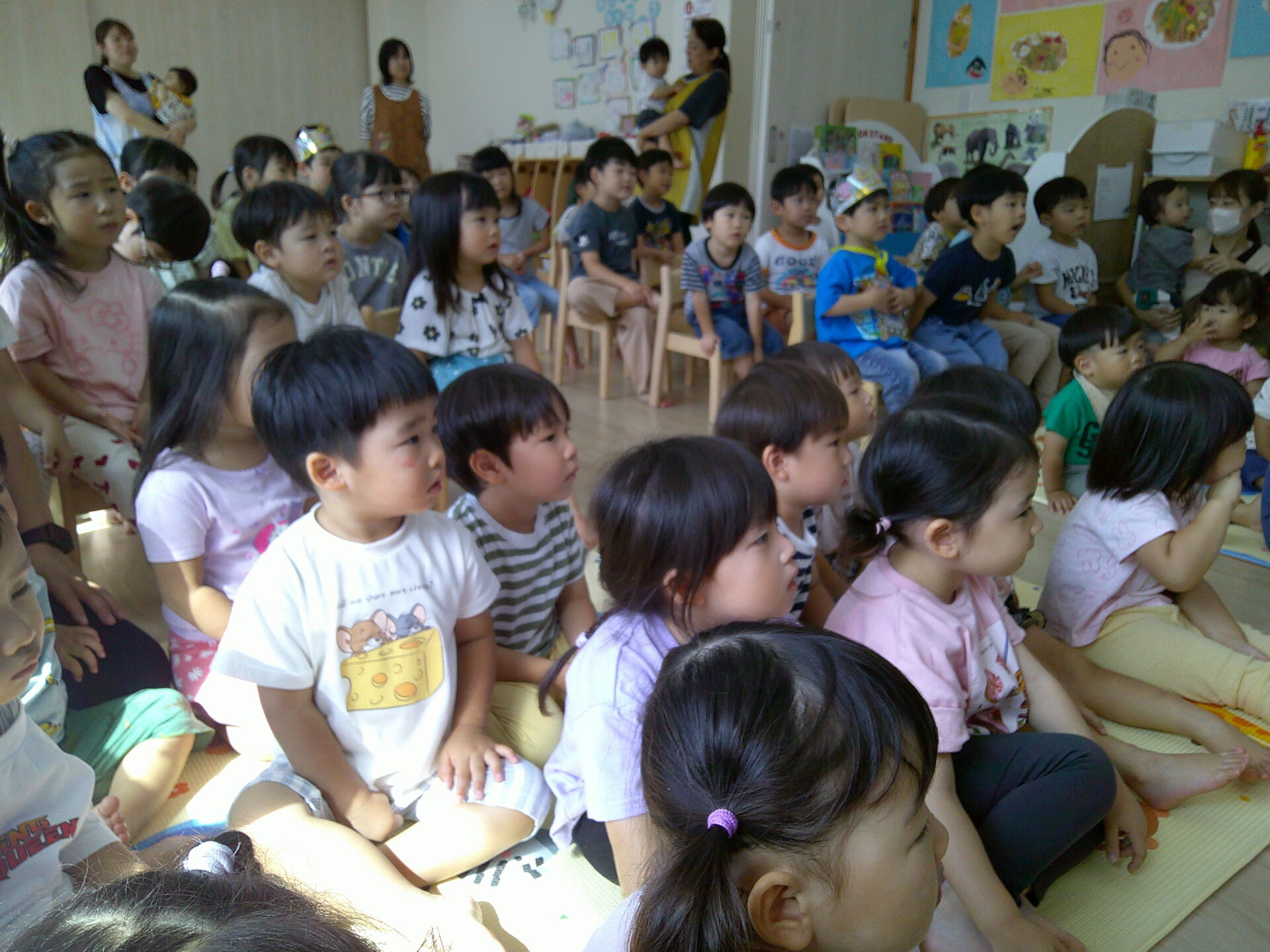 先生からの出し物では、ばけばけばけばけたくんが登場!色々な食べ物に変身していくばけたくんに「わ~!」といいリアクションの子どもたち♪