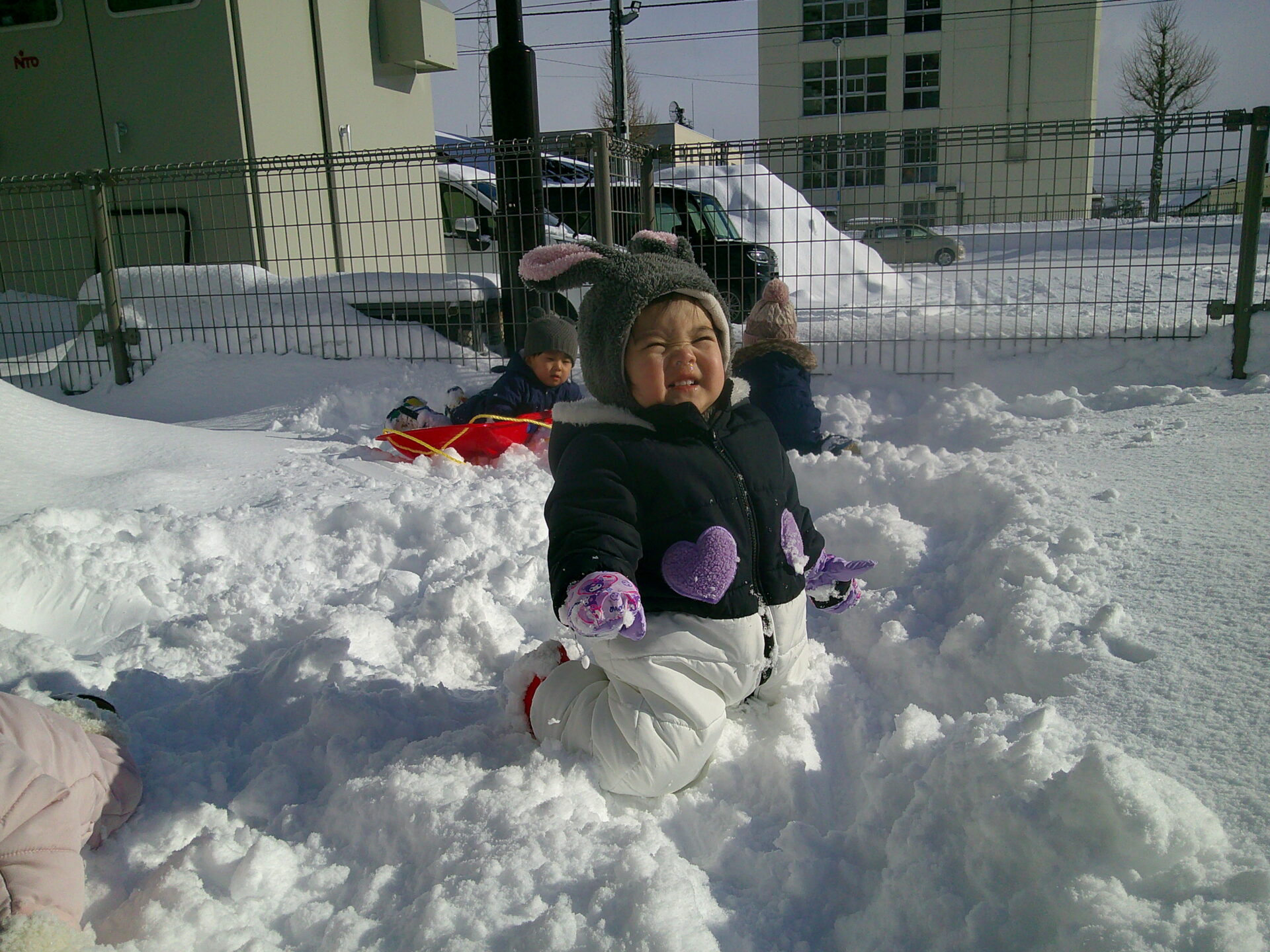 うみ(0歳)さんも園庭で雪遊び中‥!