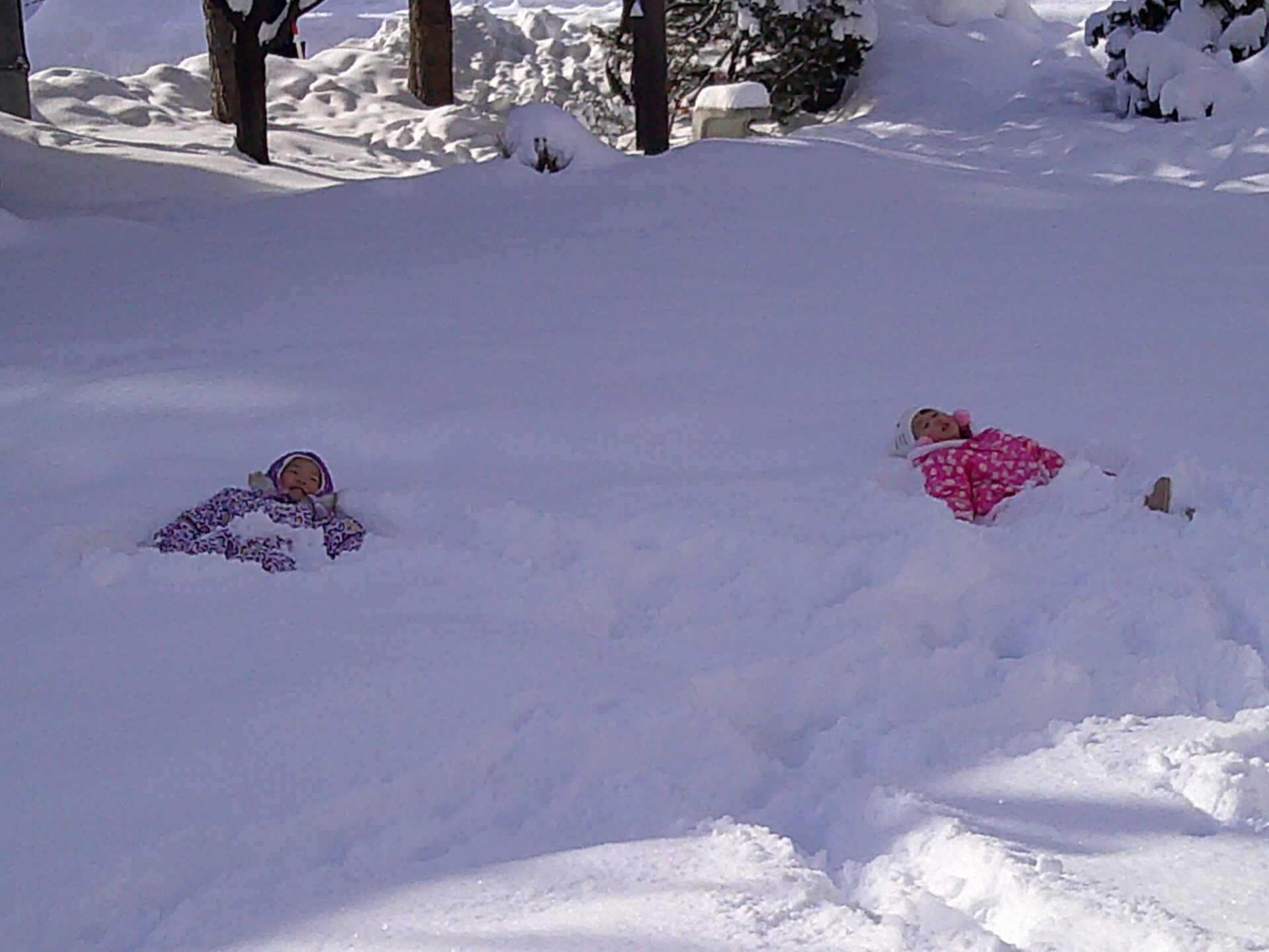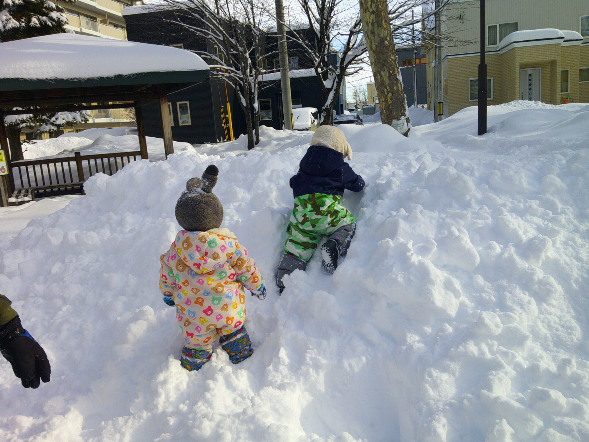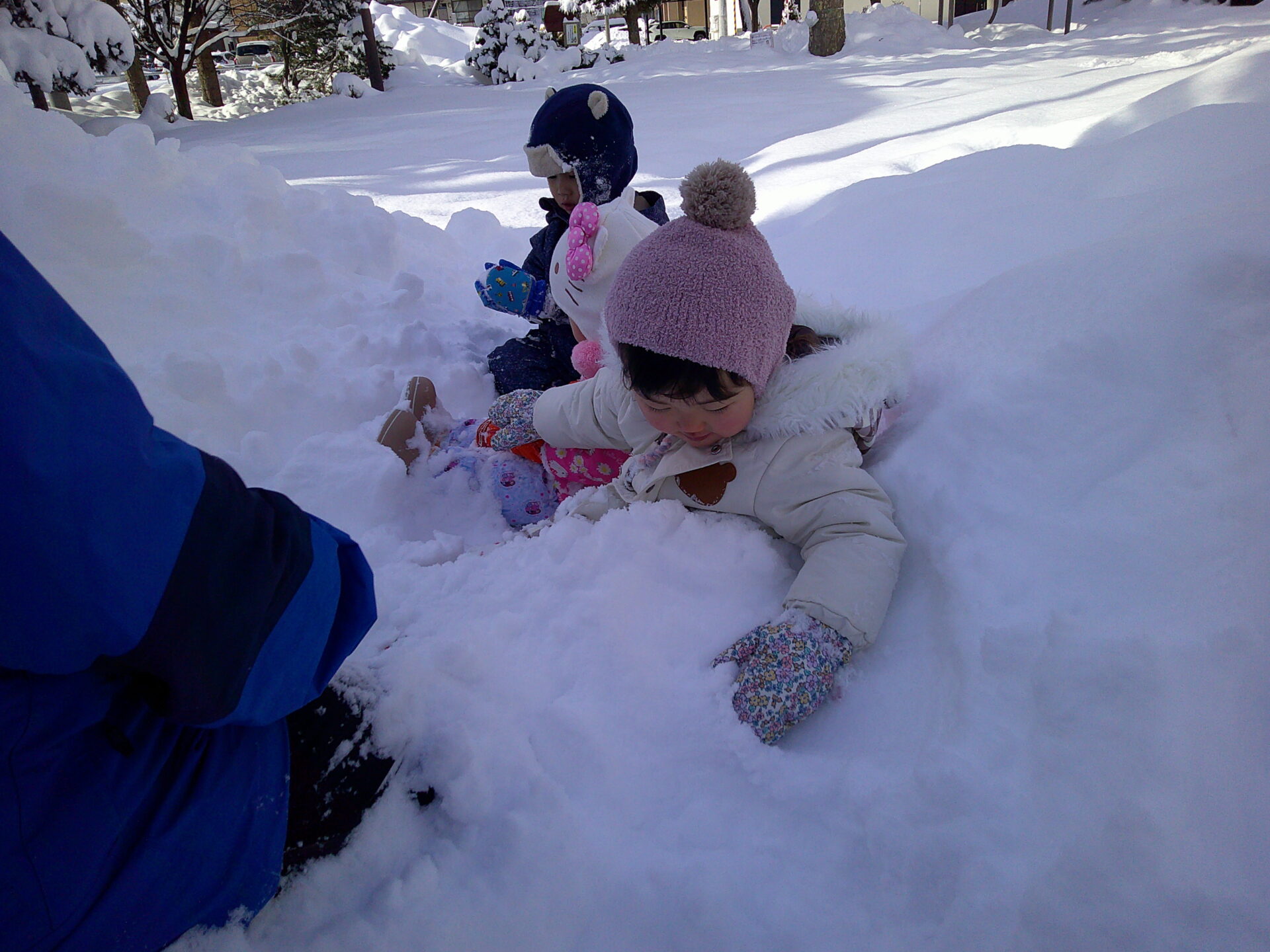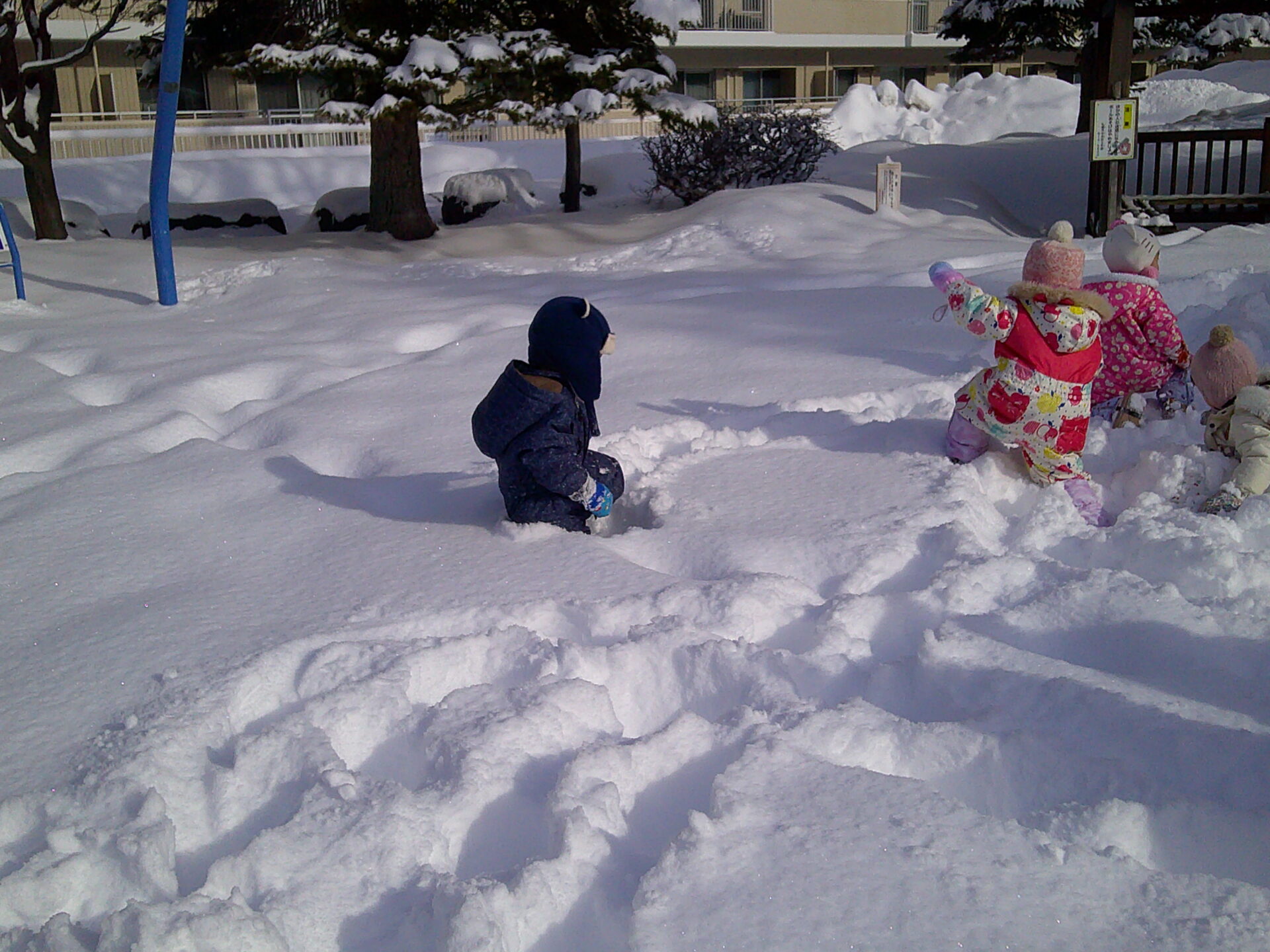 近くの公園に遊びに行くと、子ども達の膝が埋まるくらいの雪が積もっていましたよ❄
