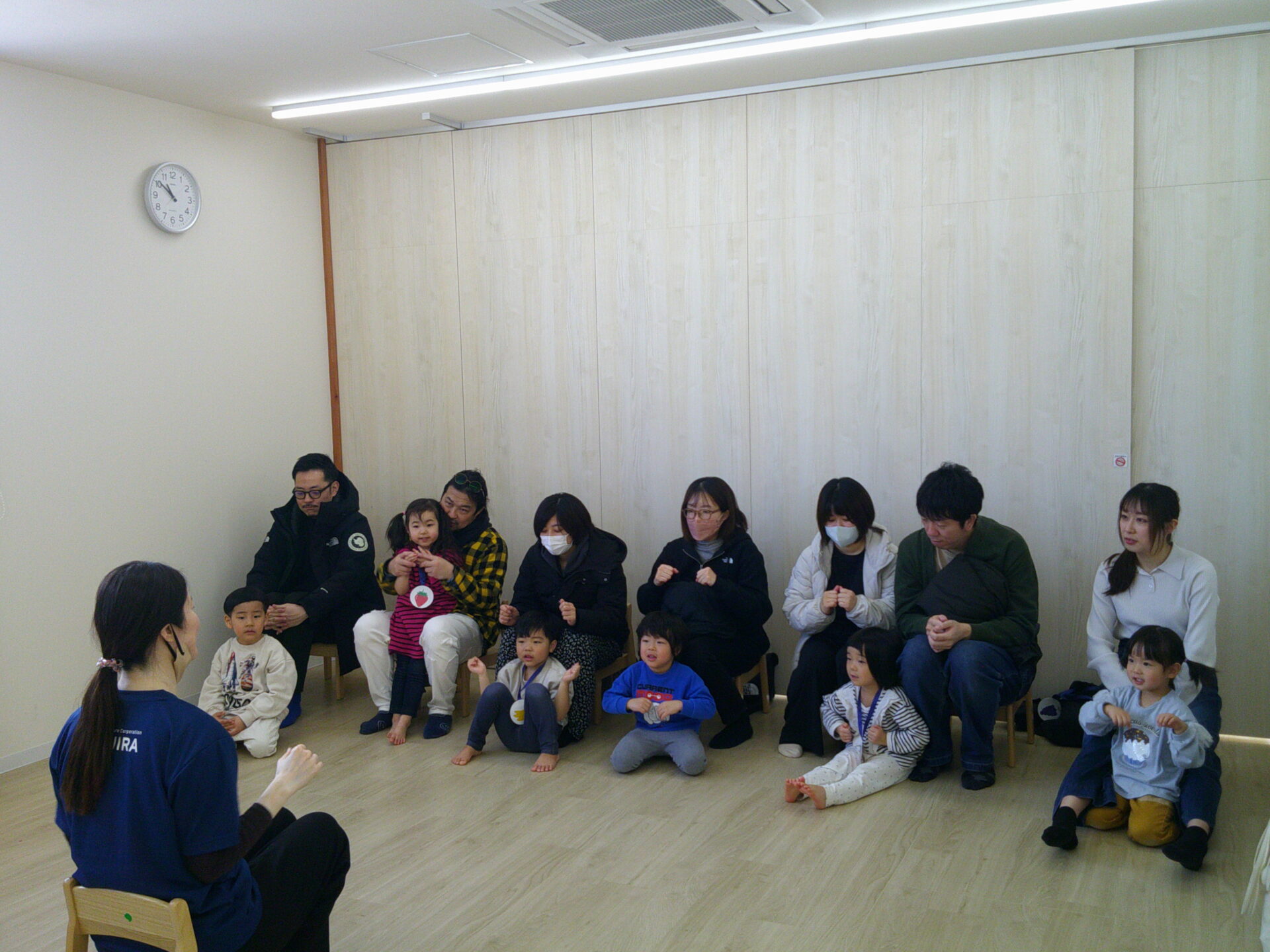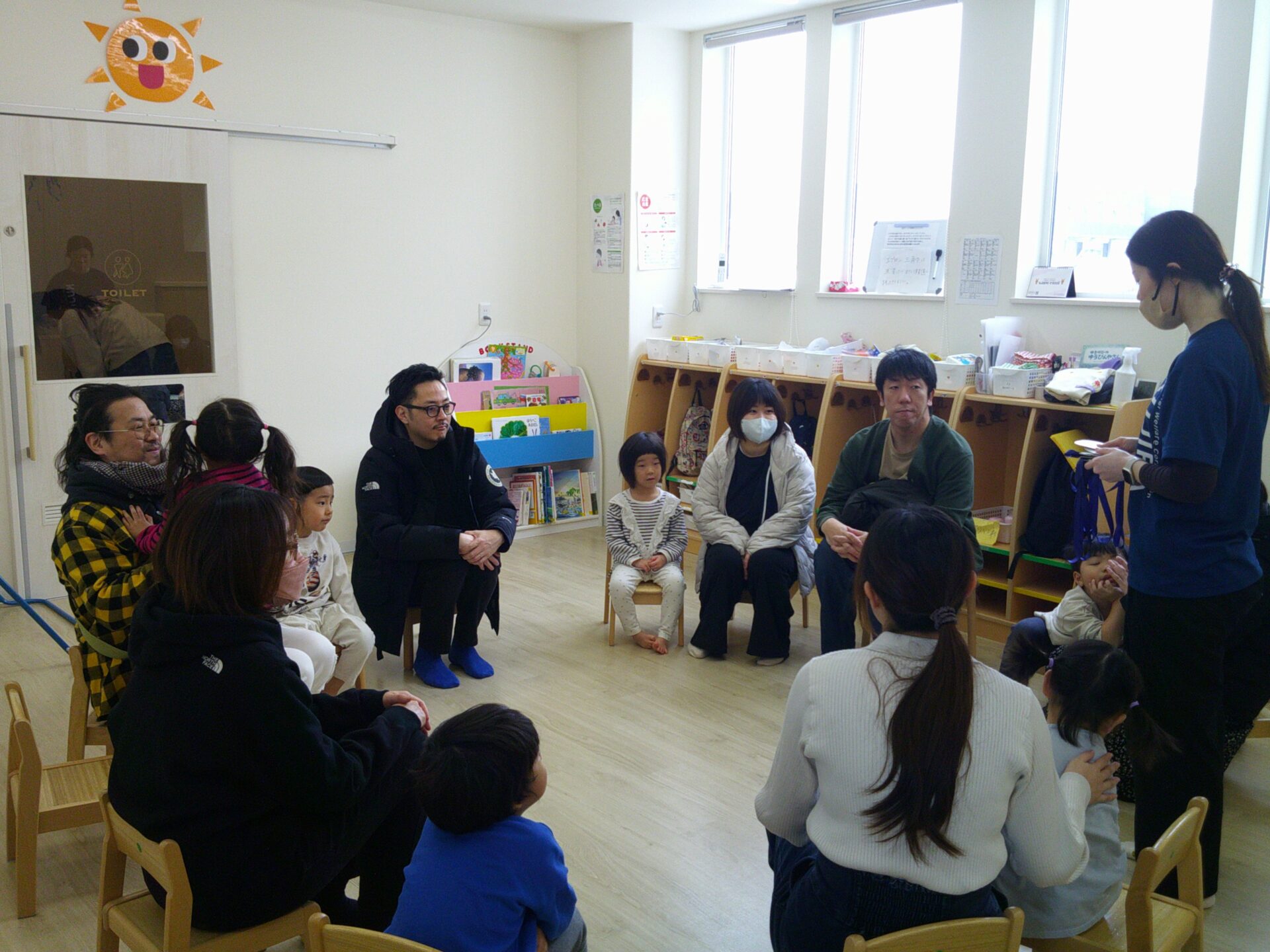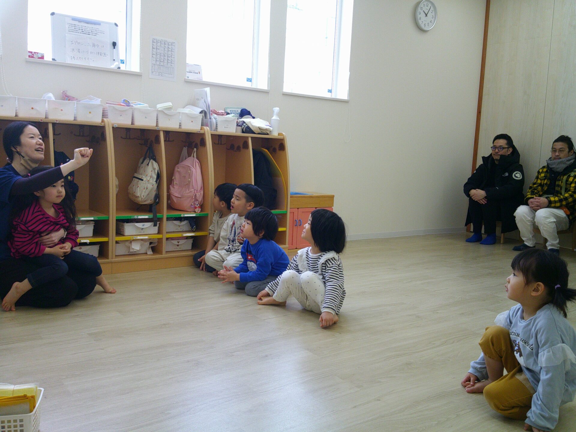 保育園でのいつもの子ども達の様子を見ていただきたいと思い、朝の会でおはようのうた、お返事、ノートのシール貼りをしました。、元気いっぱいに大きな声で歌をうたい、お返事をする姿を見てとっても素敵でしたね。